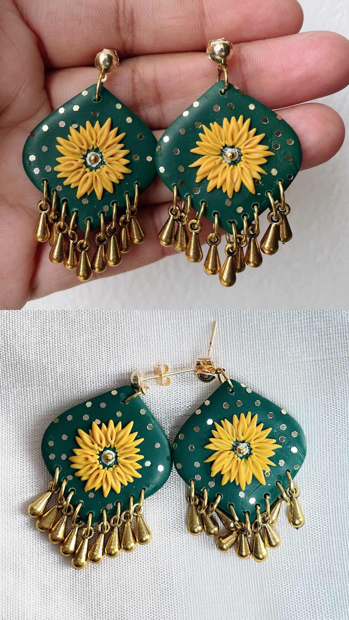 Handcrafted polymer clay festive earrings, lightweight, 18k gold plated metal, durable